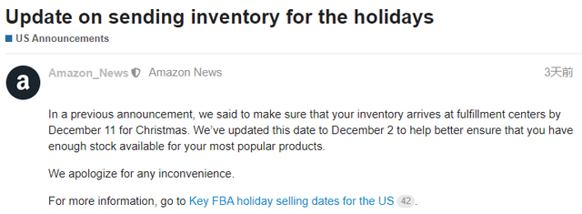 日前,亞馬遜美國(guó)站公布了旺季最晚入倉(cāng)時(shí)間,提醒賣(mài)家要確保圣誕庫(kù)存在12月11日前到達(dá)亞馬遜運(yùn)營(yíng)中心,避免假期期間出現(xiàn)缺貨的情況。